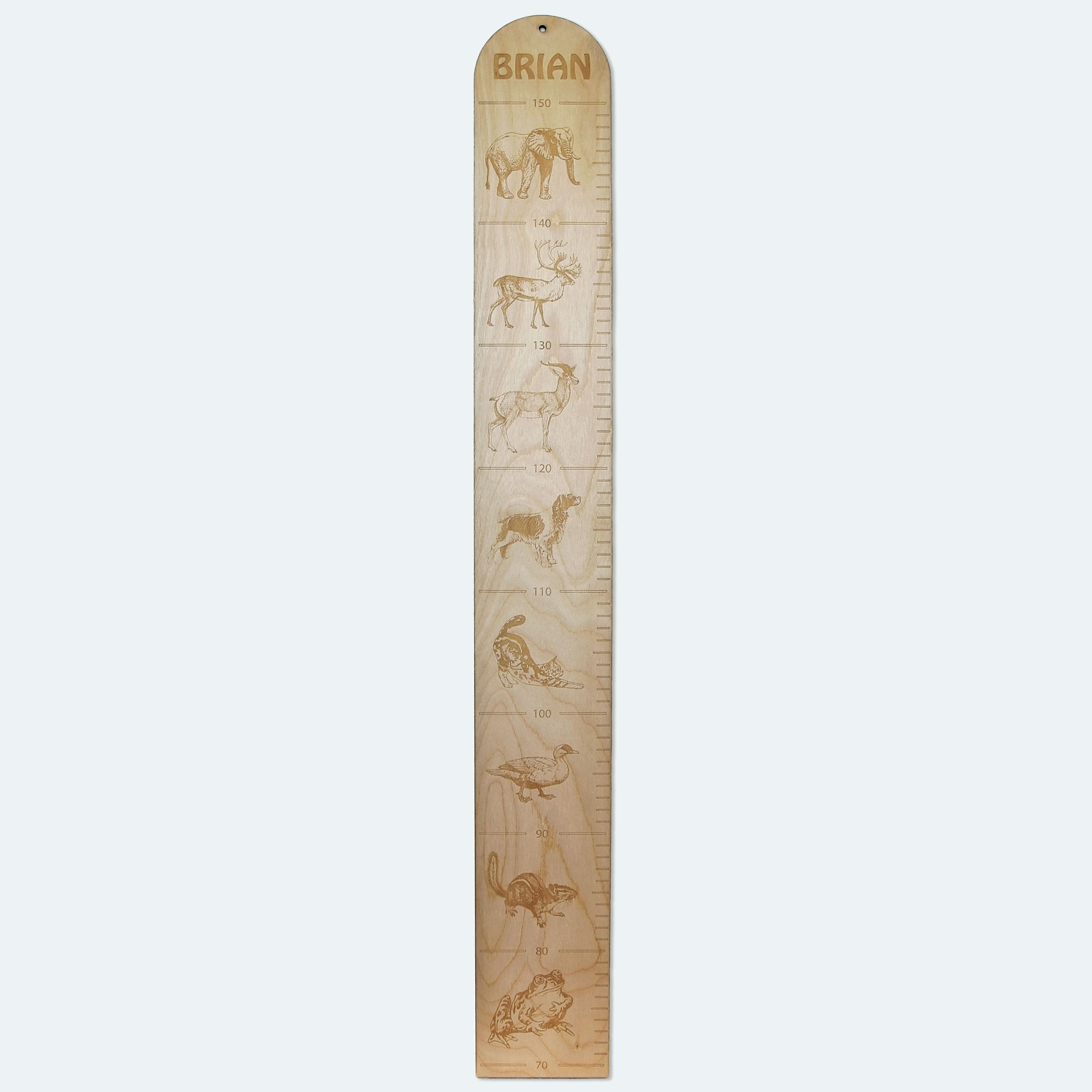 Wir gravieren die Messlatte für Kinder mit dem Namen. Die Holzlatte mit verschiedenen Tieren ist eine schöne Dekoration fürs Kinderzimmer. Die Messskala reicht vom kleinen Frosch...
