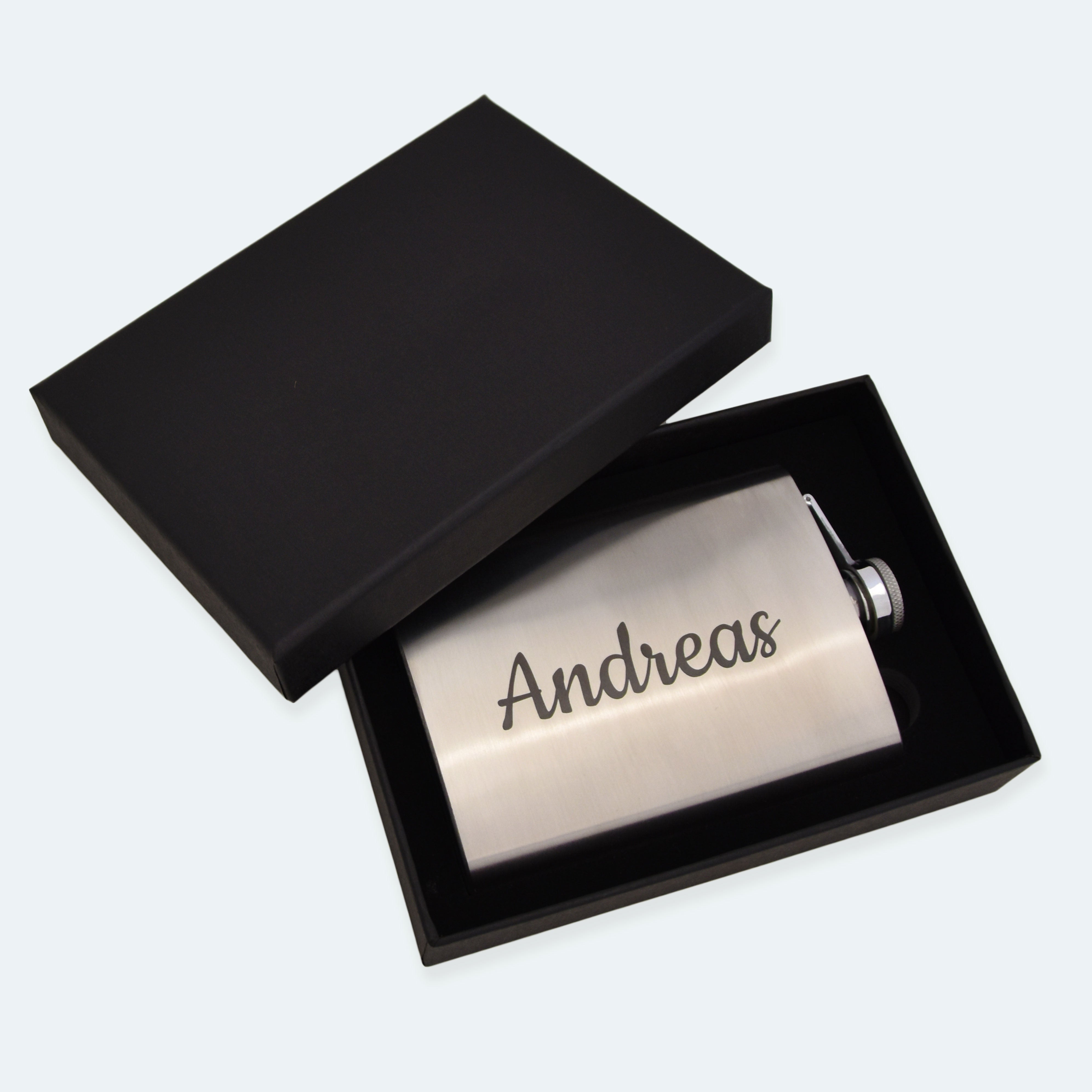 Auch unsere eleganten Edelstahl-Flachmänner in edlem Matt-Schwarz oder klassischem Silber (CNS) bieten eine perfekte Oberfläche für Lasergravuren oder Druck und lassen sich zu stilvollen, hochwertigen Unikaten veredeln.