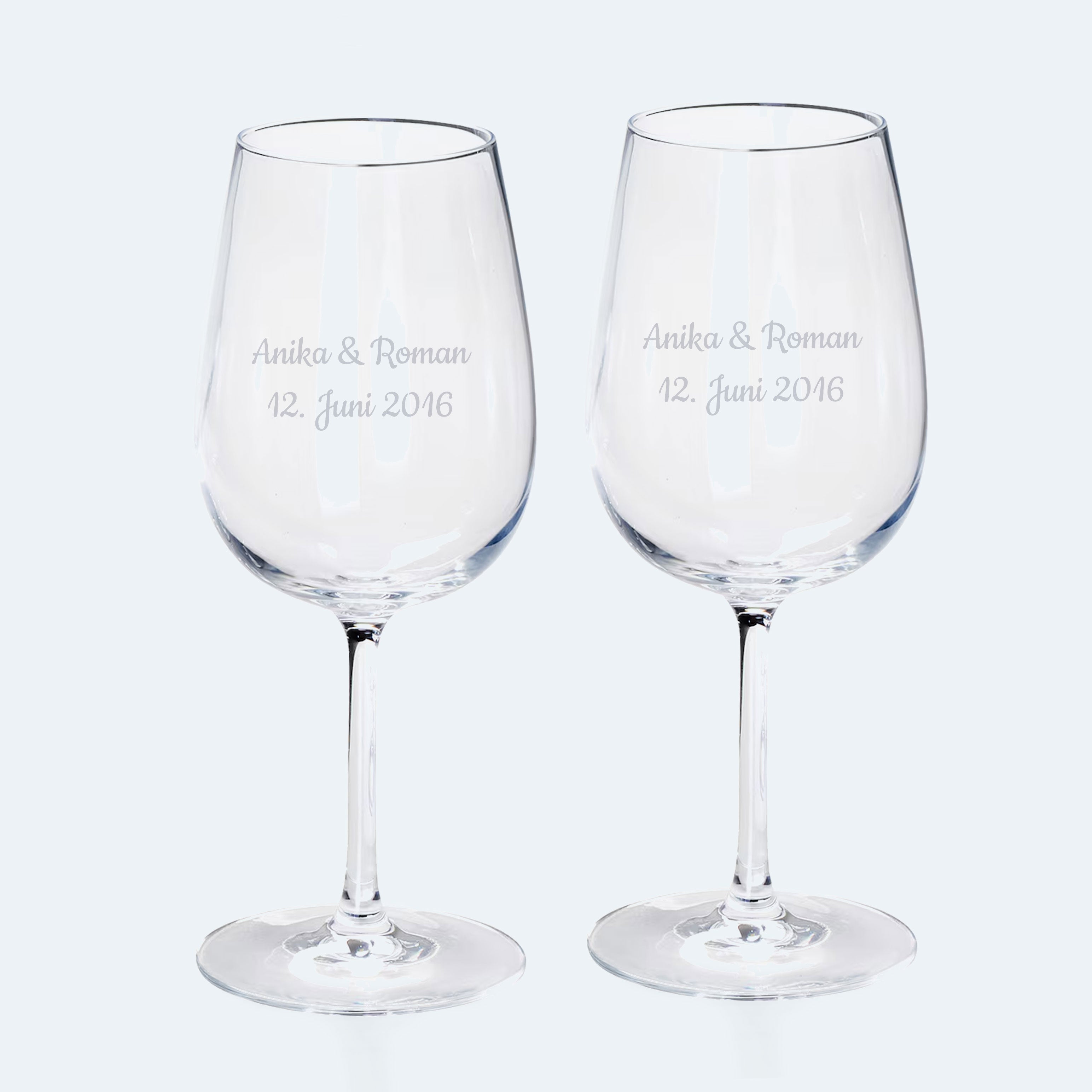 Ob zur Hochzeit, zum Geburtstag oder als Firmengeschenk – mit der persönlichen Gravur wird ein Weingeschenk zu einem ganz besonderen Präsent. Wir gravieren die zwei Weingläser...