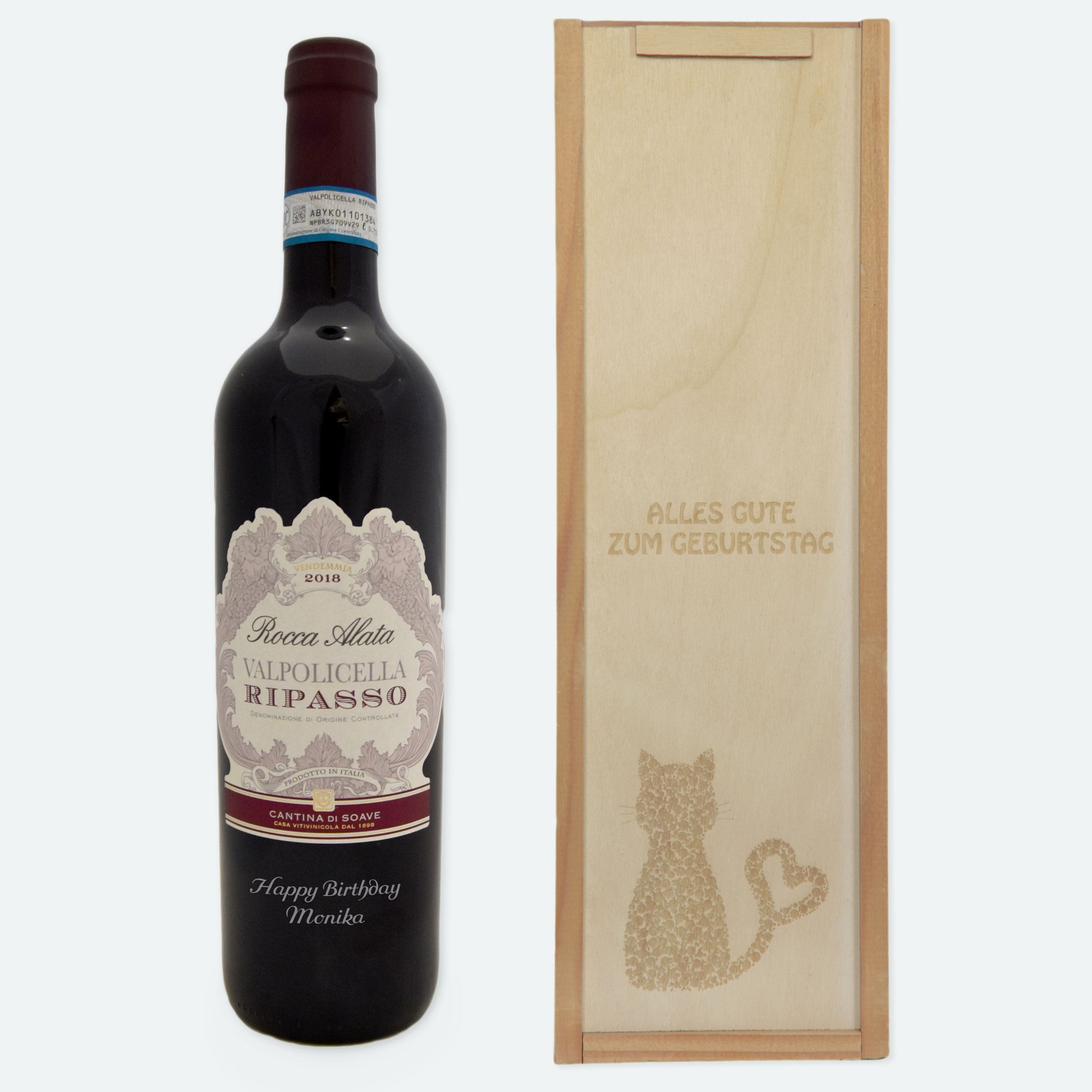 Personalisieren Sie das Weingeschenk mit feinstem Valpolicella della Ripasso Rotwein. Wir gravieren die Weinflasche sowie den Schiebedeckel der Holzkiste mit Ihrem beliebigem Text, Motiv oder Logo. Verschenken Sie die feine Flasche...