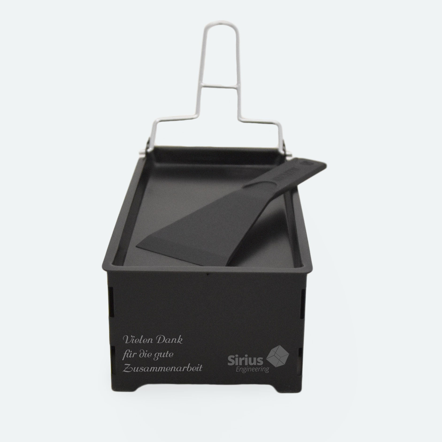 Wir gravieren den Mini Racletteofen mit Ihrem Text oder Logo. Die Lasergravur ist wasser- und abriebfest. Schmelzen Sie Raclettekäse unkompliziert und ohne Strom. Das Set wird...