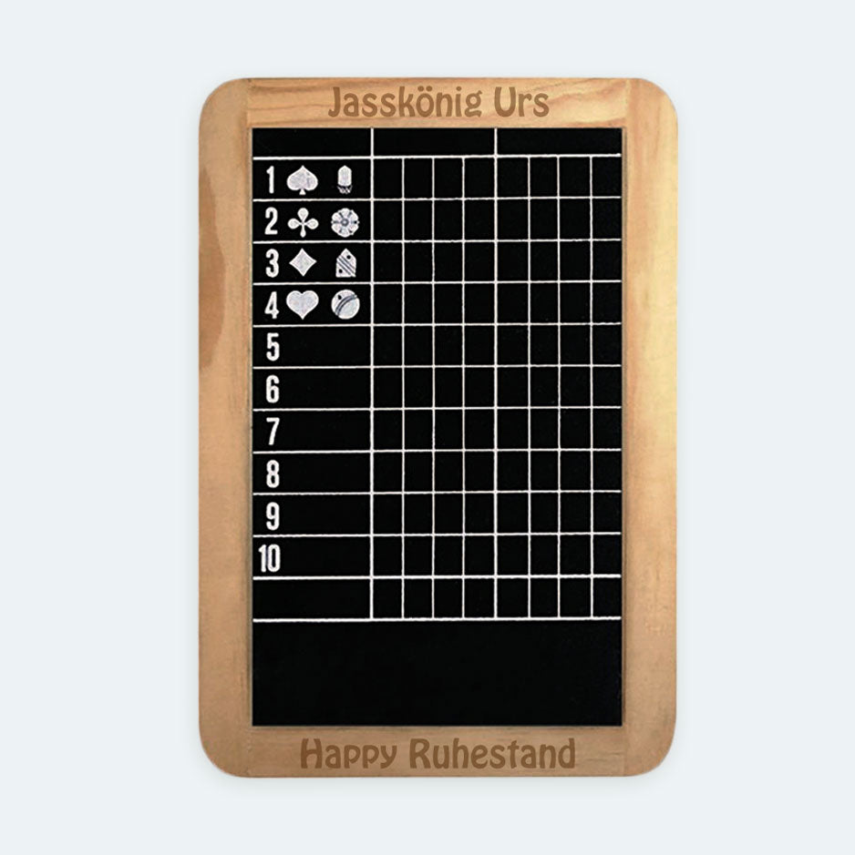 Im Onlineshop bieten wir einen personalisierbaren Kreidestift an, der zusammen mit der Jasstafel ein einzigartiges Jass-Geschenkset ergibt.