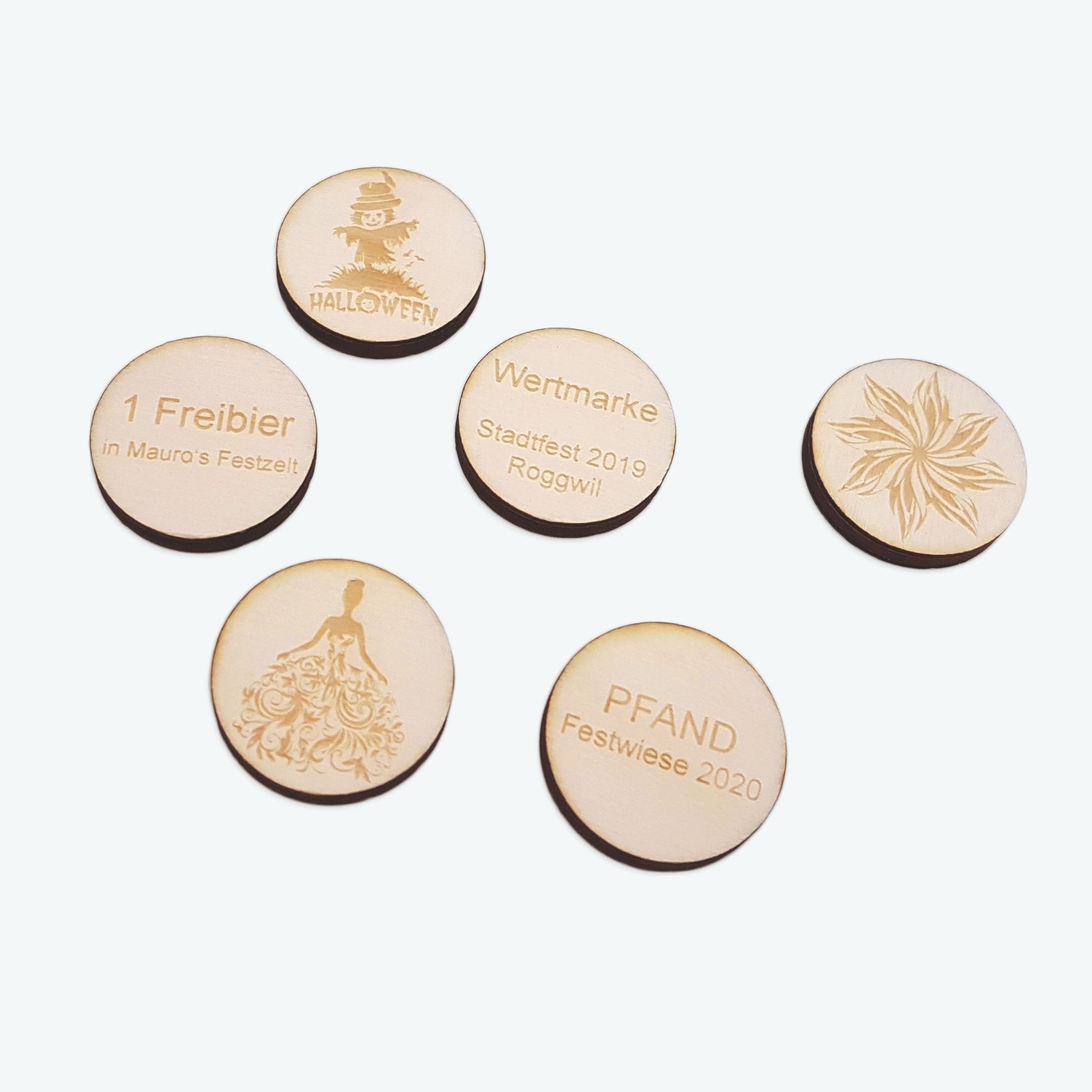 Gestalten Sie die Holz-Jetons individuell mit Ihrem Text, Logo oder Motiv . Sie eignen sich hervorragend für unkomplizierte Bezahlsysteme, z. B. als Wertmarken, Gutscheine oder Pfandchips.