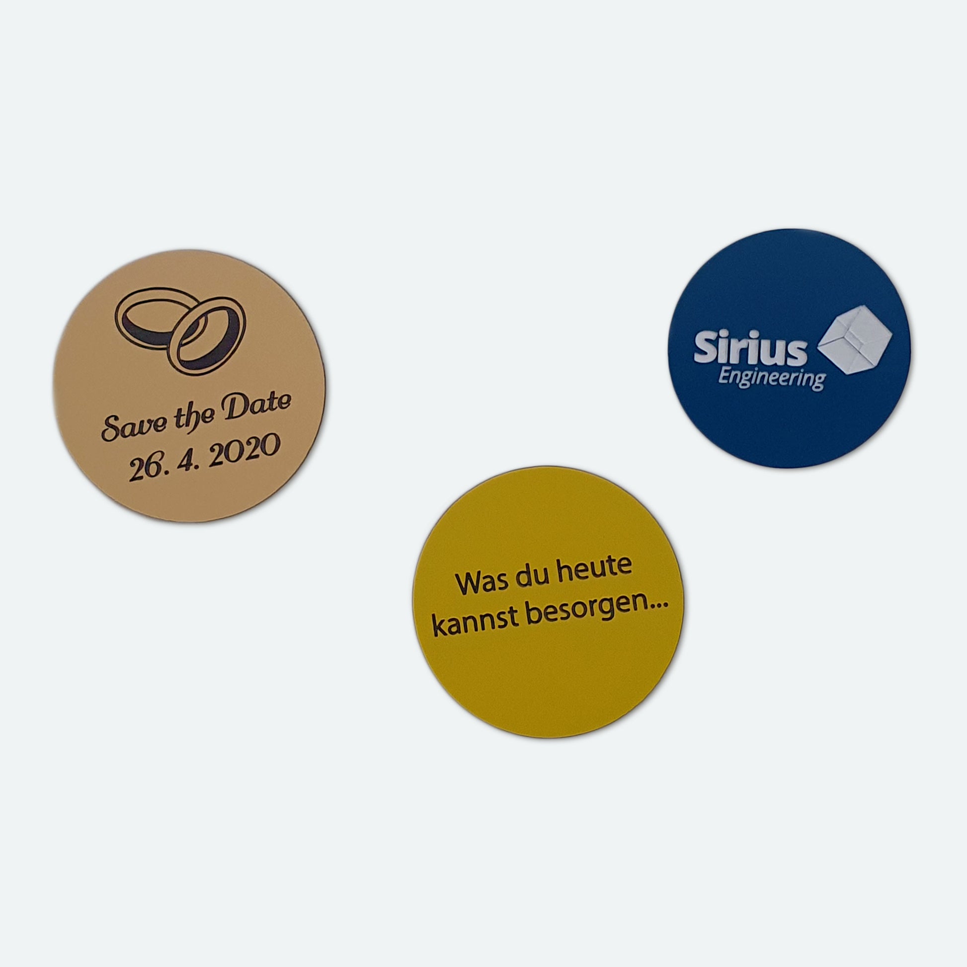 Unsere runden Kunststoffmagnete werden individuell mit Text, Logo oder Motiv graviert. Das verwendete Acryl-Laminat ist UV-beständig und wasserfest – ideal für den Innen- und Aussenbereich.