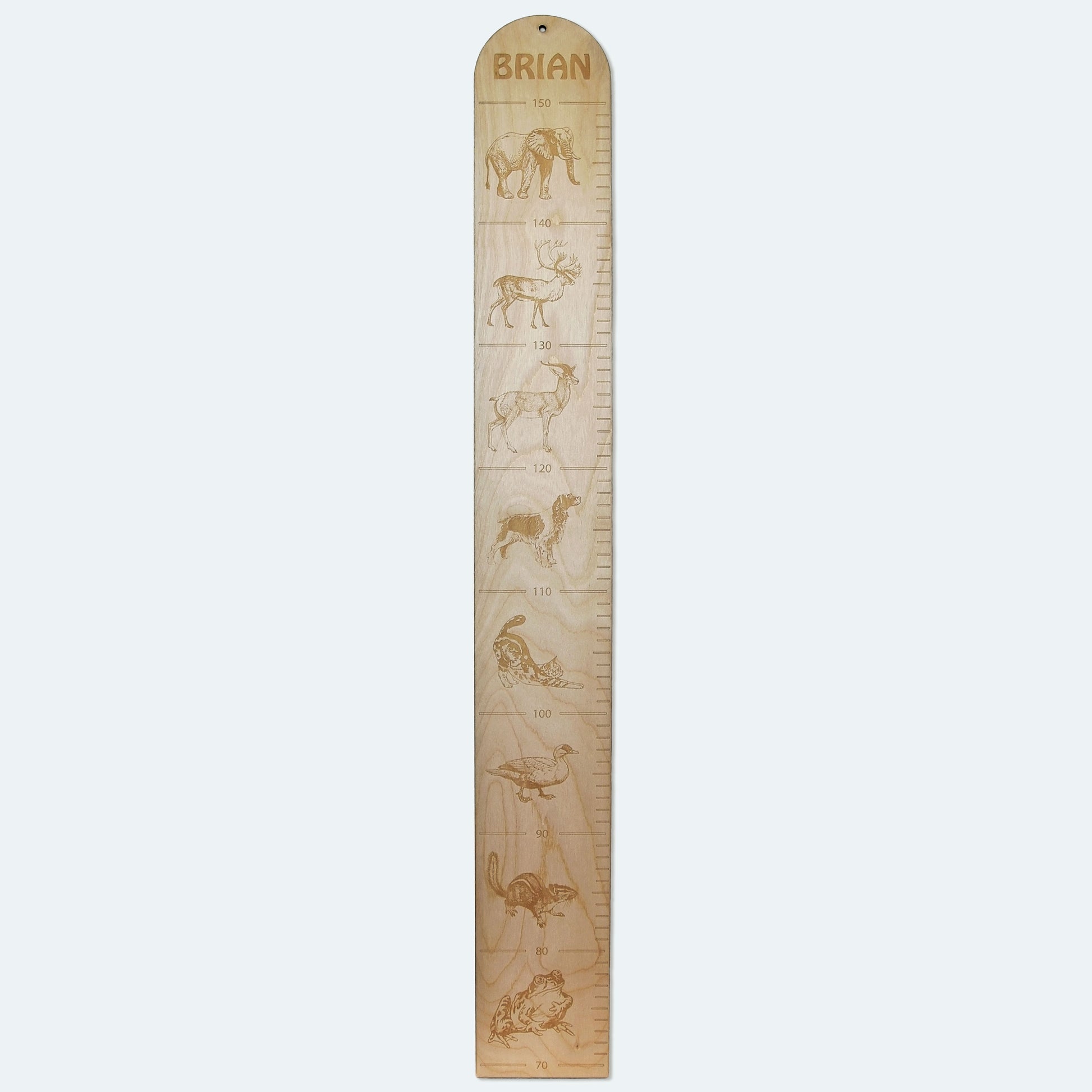 Wir gravieren die Messlatte für Kinder mit dem Namen. Die Holzlatte mit verschiedenen Tieren ist eine schöne Dekoration fürs Kinderzimmer. Die Messskala reicht vom kleinen Frosch mit 70 cm bis zum großen Elefanten mit 150 cm.